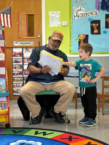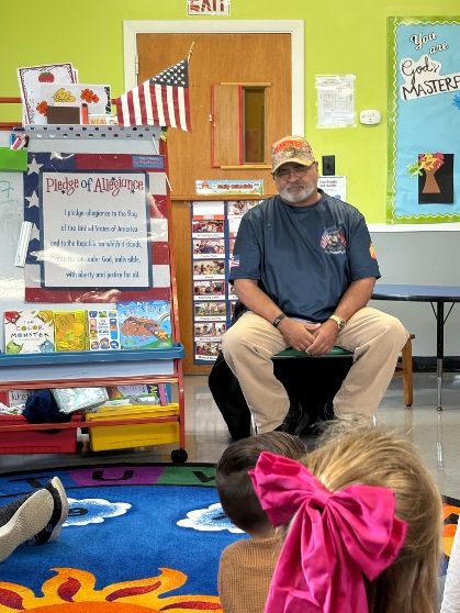 The children at Smith Mills Christian Preschool & Kindergarten learned about Veteran's Day from Veteran Marine Sgt. Manuel Soares. Sgt. Soares visited the classroom and spoke with the children about being in the Marines and keeping us safe. The children also listened to a story and asked questions like what did he do, if he played sports, what did he eat, and what did he wear. Sgt. Soares served 12 years in the Marines and served in Desert Storm. All the students and staff thanked him for his service and invited him to come back and visit.