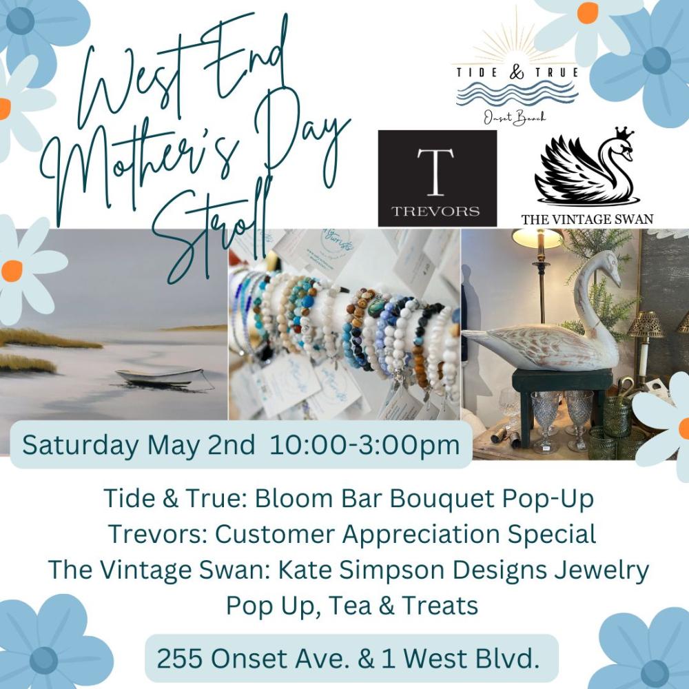 Stroll through Onset's West End with three local businesses, Tide & True, Trevor's Art & The Vintage Swan for a Mother's Day Stroll. Each location has a little something extra special going on in honor of the upcoming Mother's Day holiday. It's the perfect day to bring Mom to your favorite shops OR come and shop gifts for Mom!