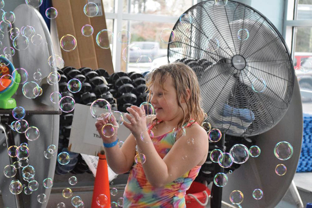 A boy inspects some of the bubbles he caught. There was something bubbling up at the Gleason Family YMCA on Saturday, Feb. 21 and it was actually bubbles! Kids ran around in the bubble corner near the pool, filling the air with, catching and popping bubbles all while enjoying the pool.