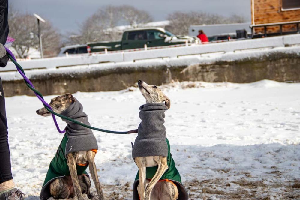 Evie and Josie, two 7-month old Whippets patiently wait for treats.