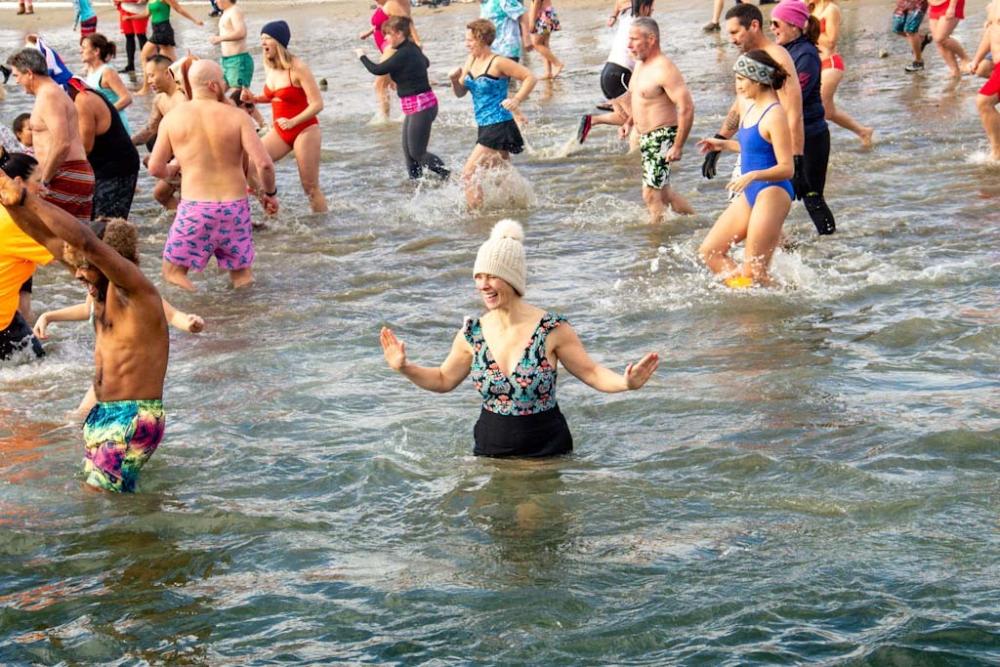 Hundreds rush into Onset Bay during the annual Polar Plunge. Photos by Bobby Grady