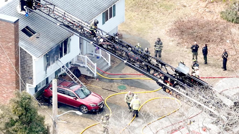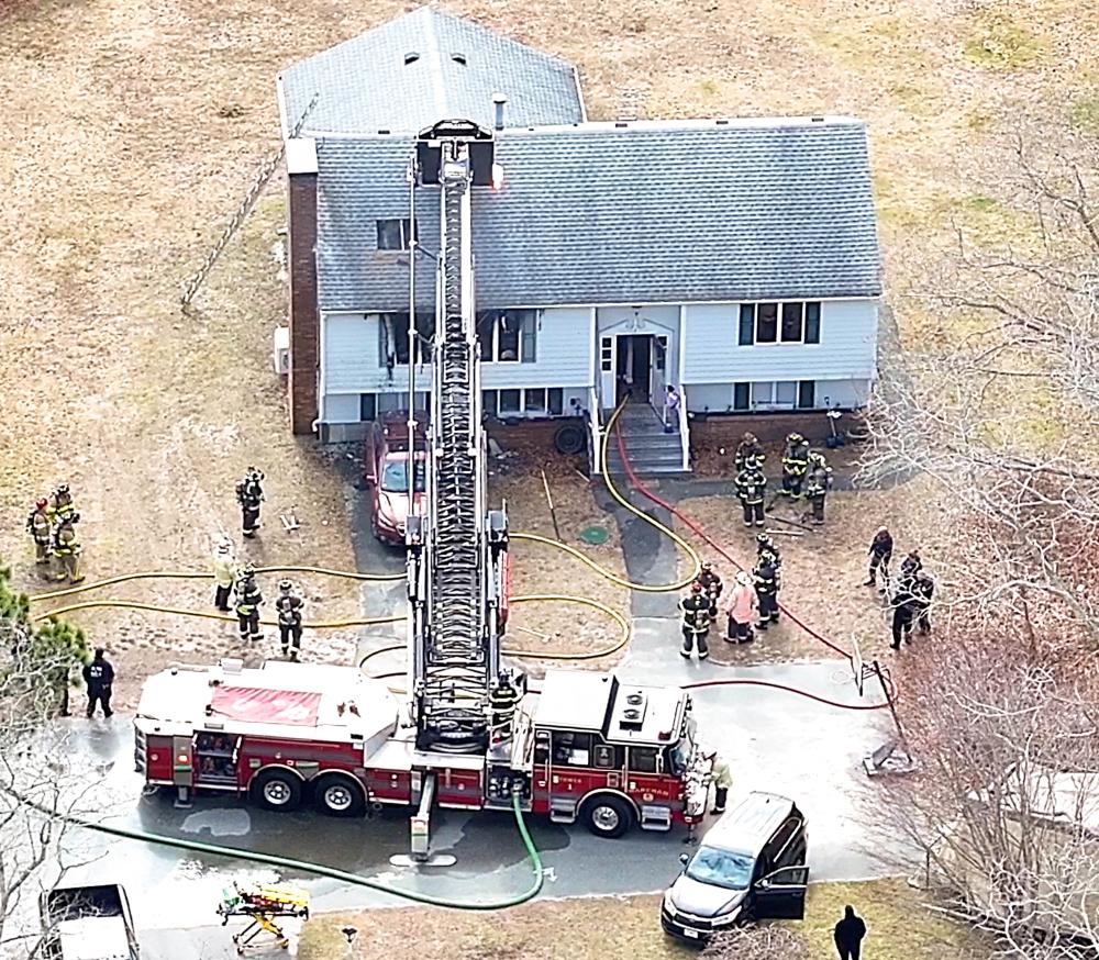 A firefighter nearly fell through a roof in the afternoon of Friday, March 20 while battling a two-alarm house fire at 4 Dusty Lane in Onset.