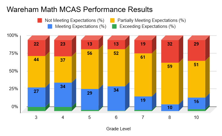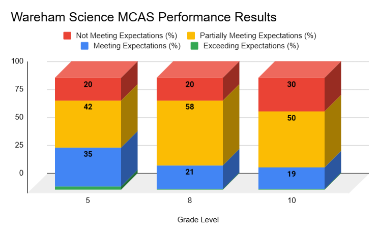 Wareham finished with 31% of their students across the three grades meeting or exceeding expectations in science while the state recorded 42%.