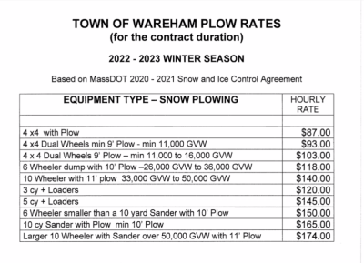 Sullivan pleaded with people to sign up as snow plow operators for the town. Wareham plow operator wages start at $87 an hour for those driving a 4x4 with plow and go up to $174 an hour for those driving a large 10-wheeler with a sander, 11-foot plow and gross vehicle weight over 50,000 pounds.