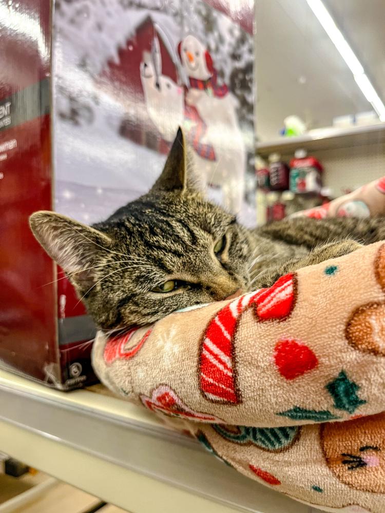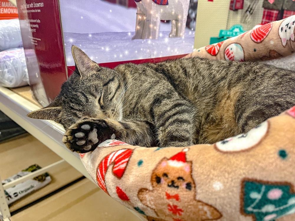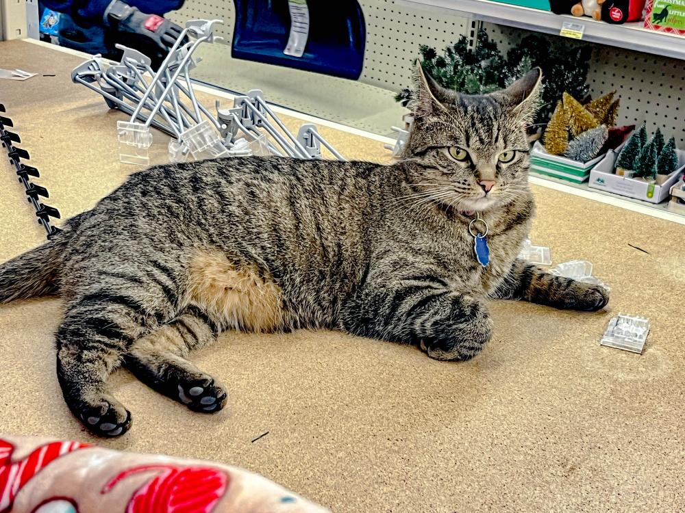 Feline fine by the Christmas decorations.Those purr-using the aisles of the Aubuchon Ace Hardware at 137 Marion Road should mind their ankles while shopping, as one employee has a knack for swatting at pant legs.