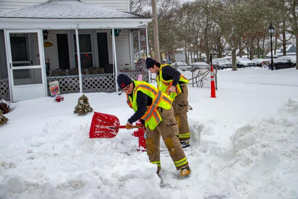 Onset fire fighters Bobby Haskell and Michael Crump shovel out a fire hydrant.