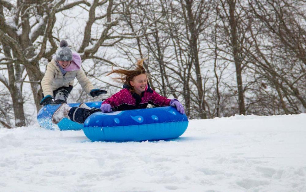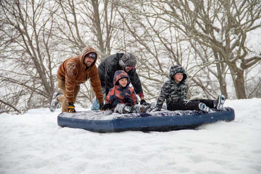 Wesley Hibbard, Lionel, Quinn and Connor Gagnon sled down the park.