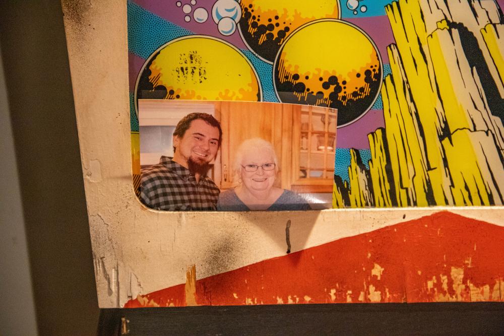 A photo of Hibbard and his grandmother on the pinball machine he inherited from her.