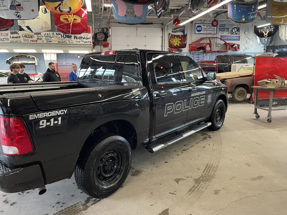 The improved truck, a Dodge Ram, can be seen rolling around in all black with rust spots eliminated and the Wareham Police logo stamped throughout.