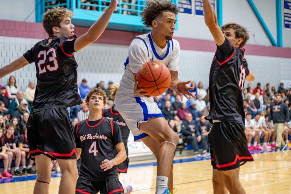 Junior Amare Rose makes pass while surrounded by Old Rochester defenders. Photos by Bobby Grady