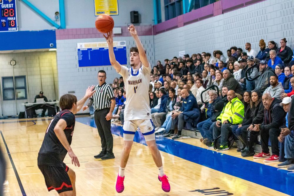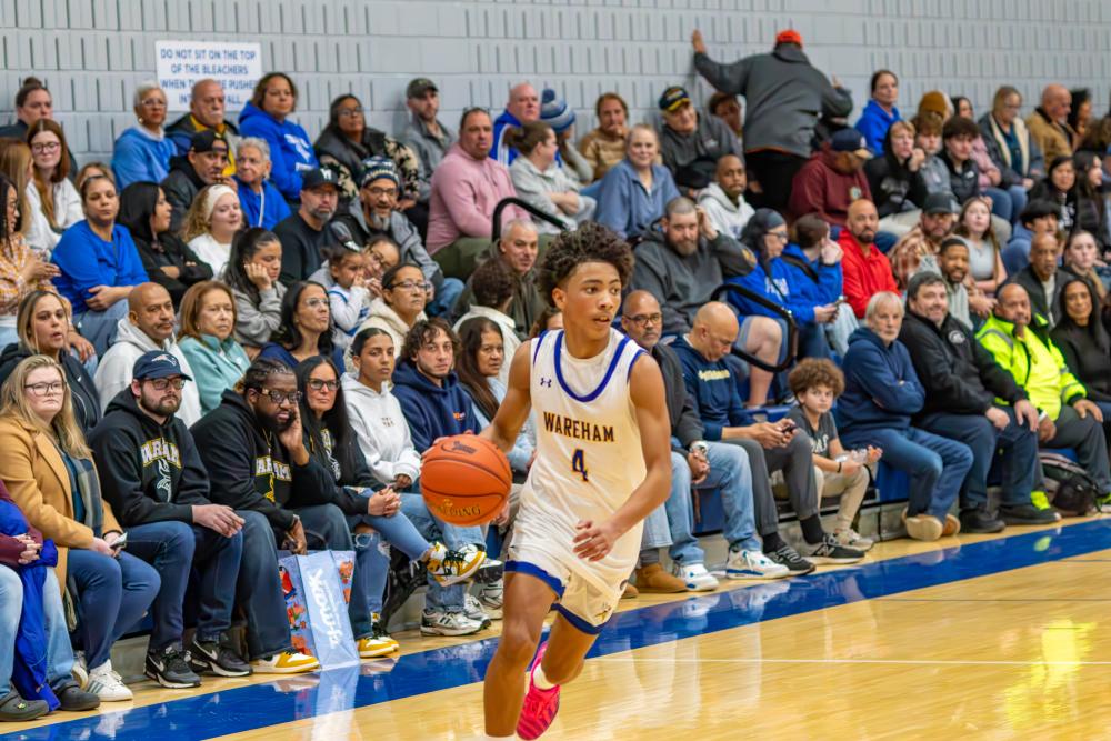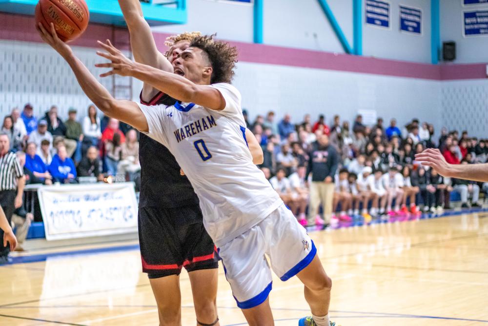 Junior Malikhi Tavares speeds past Old Rochester defenders.Basketball season is underway for the Wareham High School boys team who took home two state championships in the last three years and is coming off a second round playoff exit.