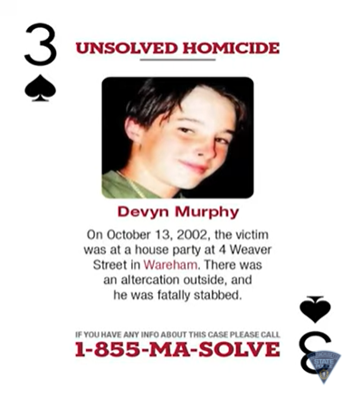 Devyn Murphy, the 16-year-old victim in an unsolved 2002 murder case, is featured on the three of spades. Each card includes a photo of the victim and a fact summary: “On October 13, 2002, the victim was at a house party at 4 Weaver Street in Wareham. There was an altercation outside, and he was fatally stabbed.”