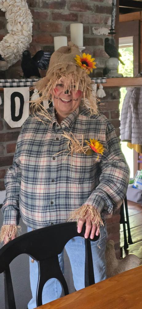 Leslie Durling, who took to Trick-or-Treat on Main Street dressed in her finest scarecrow outfit is the winner of the annual scarecrow contest put on by the association. With straw poking out of her sleeves, Durling handed out candy for Riverside Cafe.