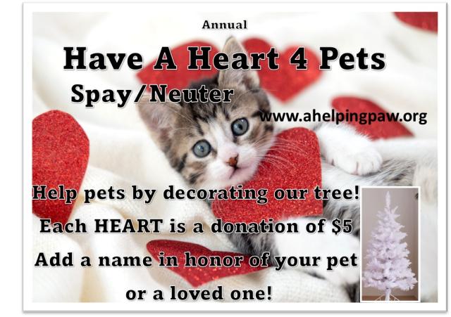 Feb SPECIAL! Low cost spay vouchers starting at just $100 for female kitty or $150 with vaccines for low-income pet owners. Help us FIX the overpopulation problem. Apply at www.ahelpingpaw.org. Donations to help are always urgently needed!