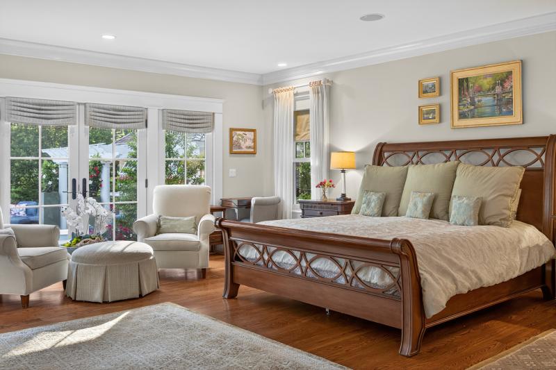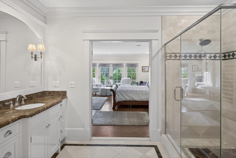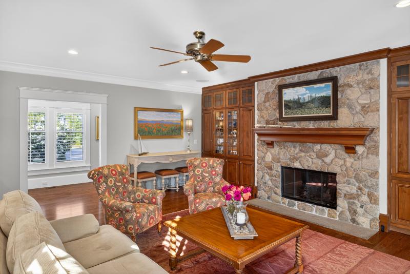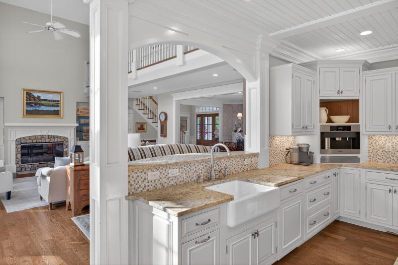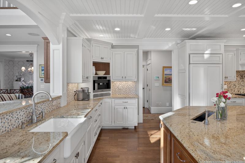 Live like you're on vacation at this spectacular Bay Club estate, where timeless design meets resort-style living. Privately situated on 1.58 acres with views of the 15th & 16th fairways, this custom home features a soaring great room with cathedral ceilings, fireplace and wet bar; a chef’s kitchen with Sub-Zero, Wolf and custom cabinetry; a richly appointed study, screened porch; and a serene first-floor primary suite with marble bath. Upstairs offers four en-suite bedrooms and a bonus game and theater room with a wet bar. The finished lower level includes a home office, wine cellar, playroom, executive closet suite, gym and sauna, offering extraordinary space for relaxation, recreation and entertaining. Outdoor highlights include a heated gunite pool, jacuzzi, pool house, and a custom-designed playhouse. A detached 3-car garage includes a 1088 SF carriage house complete with bedroom, kitchen, bath, laundry, private porch, and upscale finishes. Near the village, restaurants, beaches.